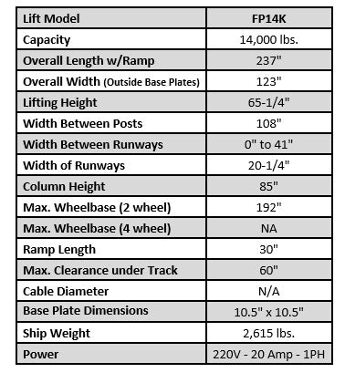 The Tuxedo FP14K 14,000 lb Four Post Service Lift is built for serious professionals who demand performance, safety, and reliability in every lift. Designed to handle everything from light-duty vehicles to large commercial trucks, this heavy-duty 4-post lift delivers unmatched stability and efficiency. The wide runways, durable C-channel construction, and powerful hydraulic operation make it a versatile choice for full-service garages, fleet operators, and performance shops. With its easy-to-use pneumatic safety release and powder-coated finish, the FP14K is engineered to perform and built to last.